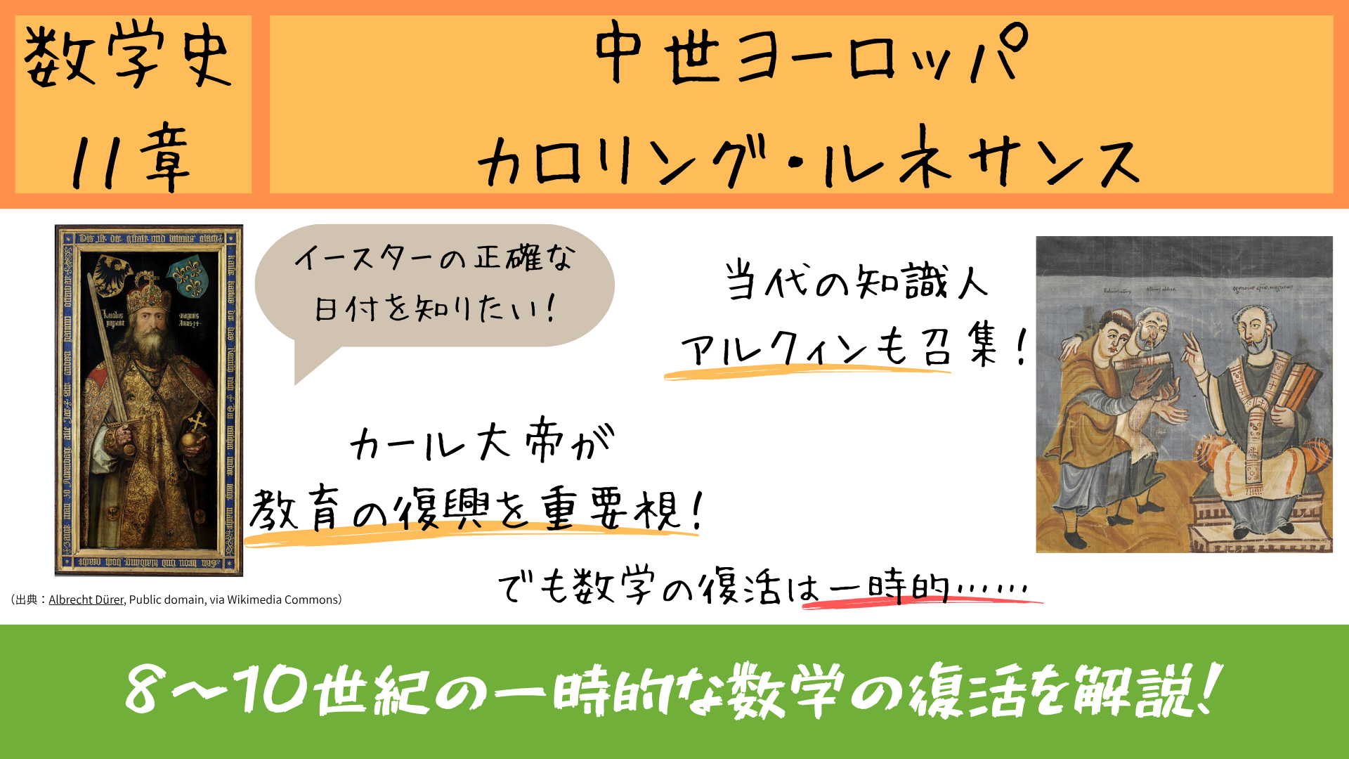 この記事では、西ヨーロッパにおける数学の「最初の夜明け」ともいえるカロリング・ルネサンスから、10世紀末にイスラーム世界の進んだ知識をヨーロッパにもたらしたローマ教皇ジェルベールまで、8世紀から10世紀にかけての数学の歴史を、数学史の先生Fukusukeが解説します。