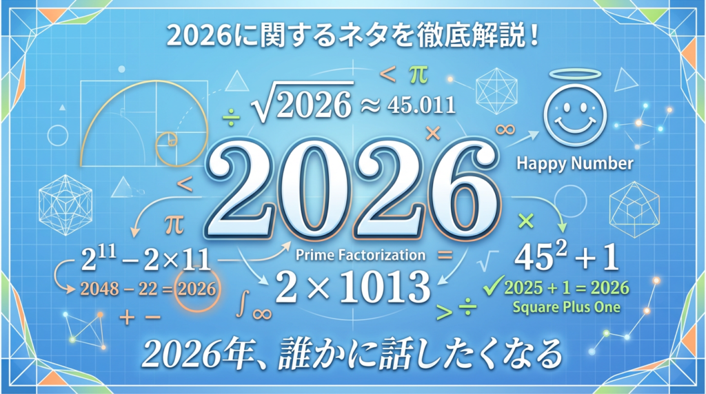 2026はどんな数?素因数分解すると2×1013の半素数になります。また、2026は各位の平方和を計算していくと最終的に1になる「ハッピー数」でもあります。この記事では、2026が持つ様々な数学的な性質を、数学史の先生Fukusukeが分かりやすく解説!2026年、誰かに話したくなるネタ満載です。 -