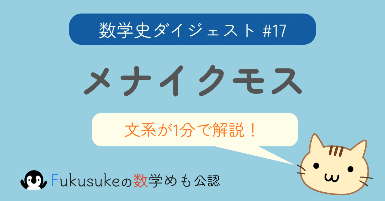 円錐曲線を利用して立方体倍積問題を研究したメナイクモスの功績、そして彼に関するエピソードについて解説してきました。