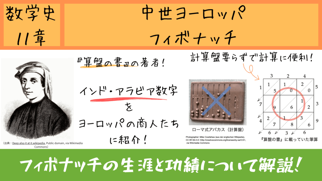 フィボナッチの生涯と功績を解説!アラビア数字をヨーロッパに紹介し商業革命を支えた数学者の業績、『算盤の書』の内容、フィボナッチ数列の誕生、そして彼が無双した数学試合まで詳しく紹介します。