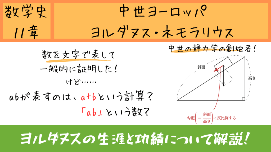 13世紀中世ヨーロッパの天才数学者ヨルダヌス・ネモラリウスの生涯と偉大な功績を解説。数を文字で表すという革新的な手法で記号代数学の道を切り開き、また静力学の創始者とも称される彼の謎に包まれた生涯と、後世への影響について現役数学教員Fukusukeが分かりやすく解説します。